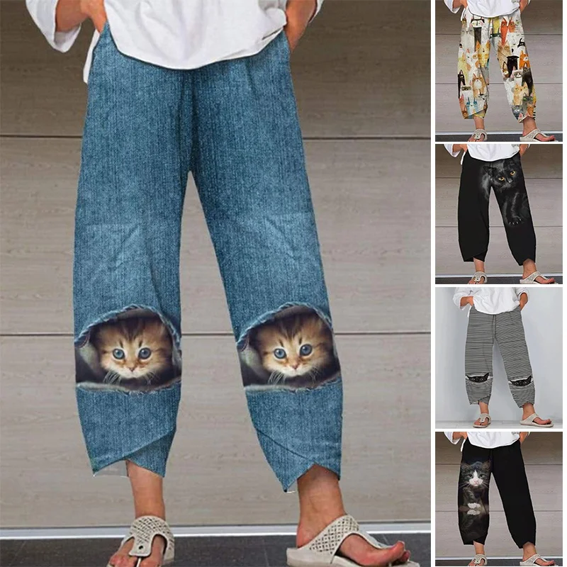 Streetwear moda feminina retro baggy pant gato impresso calças de perna larga cintura elástica harem calças mais tamanho S 5XL