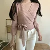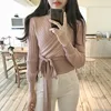 Pulôver roxo de renda com laço, moda feminina, slim, estilo coreano, cruz, gola v, bandagem, jumper top, primavera 2021, recém chegado