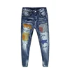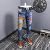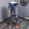 Moda streetwear calças de brim dos homens cor azul fino ajuste elástico bordado designer jeans rasgado calças de brim