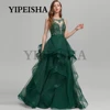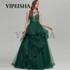 O pescoço de renda apliques a linha vestidos de noite ver através de tule ruched sem mangas vestido de festa de formatura robes de soirée vestidos