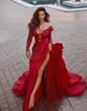 Lorie vermelho glitter sereia vestidos de noite lado dividir vestidos de baile sexy manga longa fora do ombro appliqued formal vestido de festa longo
