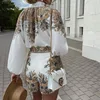 Conjunto de manga comprida estampada feminino, camiseta e shorts de outono e inverno, duas peças, botão elegante, padrão retrô