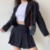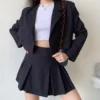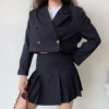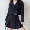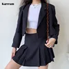 Karrram estilo preppy duas peças conjunto feminino brazer jaqueta cortada + mini saia plissada elegante sexy listrado conjuntos jk 2 peça ternos