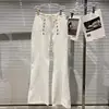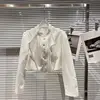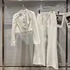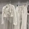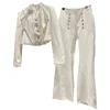 Branco flare calças define para as mulheres de borda pérola pequeno gola casaco curto + duplo breasted moda calças duas peças terno