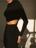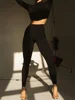 A parte superior da colheita da mola 2022 de macheda com um pescoço alto e o topo apertado da colheita é emparelhado com calças magros da cintura alta mostram sua figura