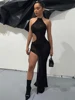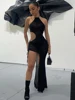 Dfllifes vestido feminino transparente oco para fora sem costas alta divisão sólida cabresto vestidos de renda para mulher sexy primavera verão 2022