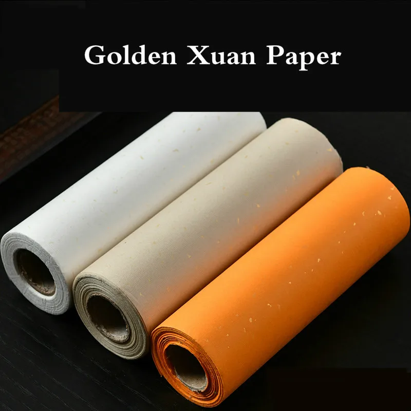 Papel de arroz chinês metade maduro 20m, folha de ouro xuan para pintura de caligrafia, rolo de papel chinês de arroz com manchas de ouro dispersas