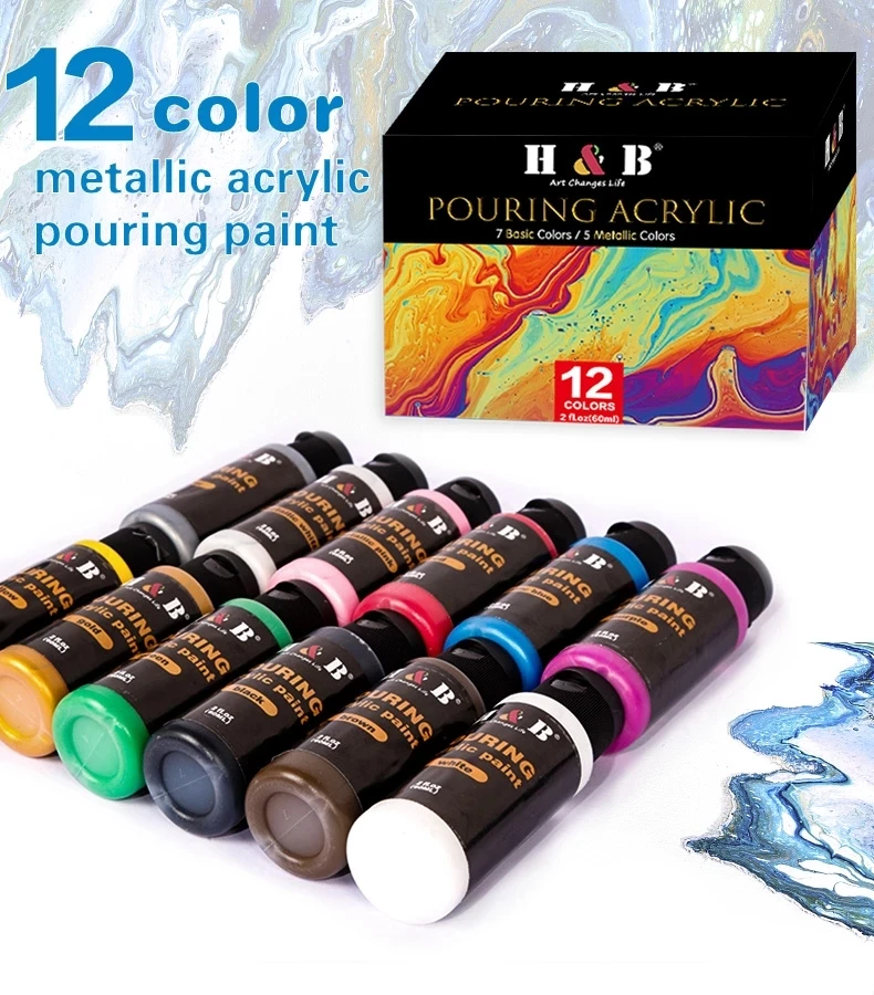 Pronto para derramar metálico acrílico derramando pintura conjunto, 12*60ml garrafas de fluido diy para superfícies esticadas lona, madeira, ar argila seca