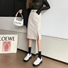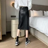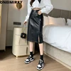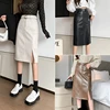 Oneimirry saia midi de couro pu, saia casual fina da moda com divisões para mulheres, marrom, com bolso para escritório, outono e inverno 2021