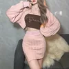 Feminino casual manga longa cor sólida malha pulôver sweatsuit 3 peça camisola curta conjuntos saia rosa com camisola